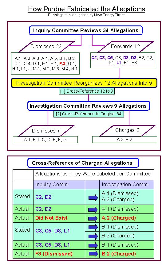 The 12 allegations of research misconduct forwarded from the Inquiry Committee (C2, C3, C5, C6, D2, D3, F2, G2, K1, L1, E1, E3) were dismissed. However, in the "reorganizing" process, the two allegations of which they found Taleyarkhan guilty (A.2 and B.2) were new. They first appear on Pages 4 and 5 in the Investigation Committee Report.
