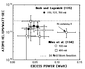 FIGURE 7. Relationship between atoms of helium per watt-sec of energy and anomalous power generated in a Pons-Fleischmann cell. Helium was measured in the generated gas and does not include helium retained by the palladium cathode. This work was done at the Naval Air Warfare Center at China Lake and at SRI.