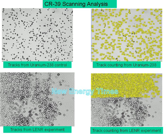 Skeptical physicists asking whether the SPAWAR group performed a quantitative energy analysis were unable to find any such results. However, skeptics are left to confront the fact that only two sources of energy affecting the test cells. The first is a few volts from the current applied through electrolysis; the second is the external electric field of about 6,000 volts. The particle tracks look identical to tracks made by nuclear particles that have at least 2 million electron-volts.
