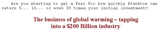 The net effect is that they create the appearance of something new, something lucrative to lure new investors, and a greater ability to promote Planktos Corp., separate from their other companies, as the billion dollar carbon-trading market begins to blossom.