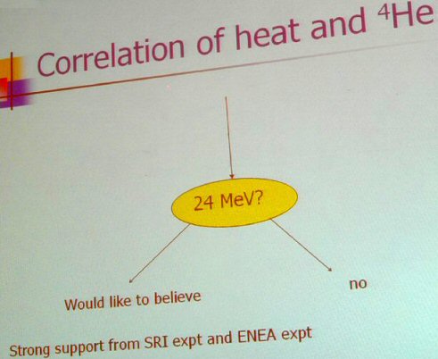 The group’s presentation concerned an experiment that appeared to be credible; it was detailed, thorough and clear. The audience was enthusiastic and supportive. But in my follow-up with the researchers involved in the work, and after some obvious reluctance on their part to discuss it with me, I learned that the data indicated only 2.5 Watts of excess heat, which is still not trivial. The researchers told me that they had made an interpretation error, and I simply reported that fact in the following issue of New Energy Times without criticizing them.