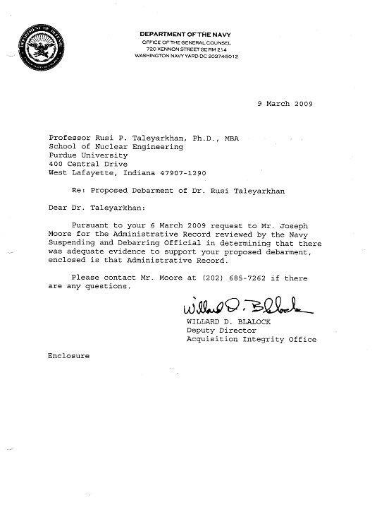 On Feb. 13, 2009, Purdue University professor Rusi Taleyarkhan received a proposed debarment letter from the Navy's Acquisition Integrity Office. Taleyarkhan then provided corrections and his response to the proposal.