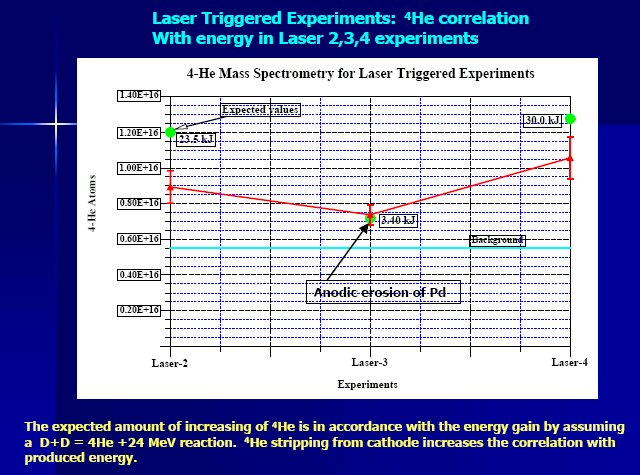 Slide presented at American Physical Society meeting, March 2005. Caption states, "The expected amount of increasing of 4He is in accordance with the energy gain by assuming a D+D = 4He + 24MeV reaction. 4He stripping from cathode increases the correlation with produced energy." [5]