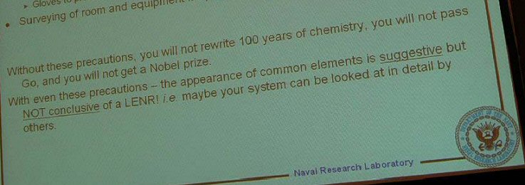 Or was the audience the LENR researchers themselves? And why? New Energy Times does not have answers to these questions. The only thing we know for sure is that, as Kidwell told us, he was invited to speak at ICCF-14 by Michael Melich, a former NRL laboratory head who is now at the Naval Postgraduate School and seems to have a way of controlling LENR research at NRL. (See “NRL 2009—The LENR Null Results Laboratory, Again” in this report.)