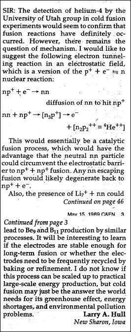 Neutrons produced by weak-interaction inverse beta decay were even mentioned by Larry A. Hull back on May 15, 1989, in a letter to Chemical & Engineering News.
