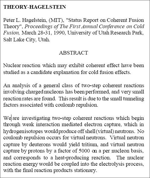 He was very straightforward and did not attempt to use sophistry to co-opt non-fusion approaches as fusion. In the next paragraph, Hagelstein explains his interest in the nonfusion, weak interaction, neutron-based hypothesis.