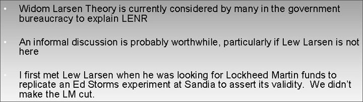 New Energy Times is aware of a few of these meetings. One was a Defense Threat Reduction Agency meeting on Dec. 12, 2006, in Ft. Belvoir, Va. Widom and Larsen were the only two speakers invited to present a theory of LENR.