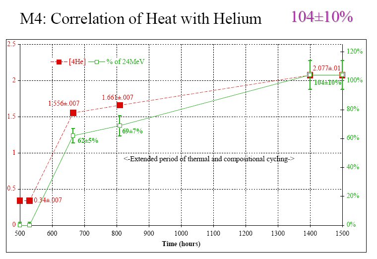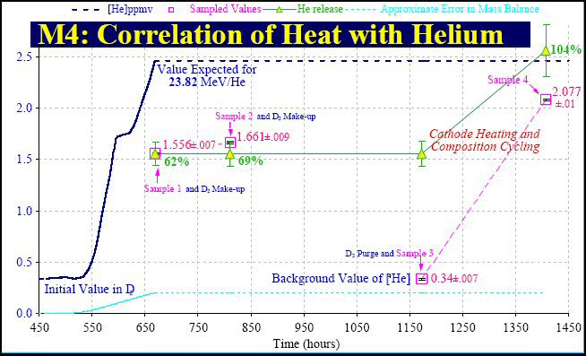 Helium samples were measured from the collected gases that evolved from the experiment. The first sample measured 1.556 parts per million. From this concentration, the researchers were able to calculate the quantity of helium-4 atoms produced. When they compared the measured ratio of heat to helium-4 to the hypothetical ratio (24 MeV per helium-4 atom), the authors determined that, "in Sample 1, only 41 percent of this amount was found." (See the image below.)