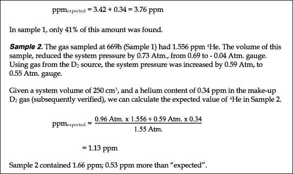 For the second helium sample, the ratio was too high, as the authors wrote: "Sample 2 contained 1.66 ppm, 0.53 ppm more than expected." Sample 2 was 147 percent of the hypothetical ratio of 24 MeV heat per helium-4 atom.