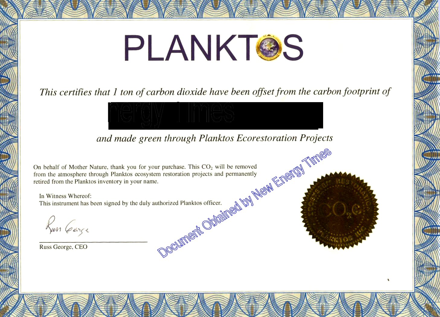 As a test, a New Energy Times reader purchased $10 worth of Russ George's "carbon credits." In return, he got the certificate shown below, which states:
