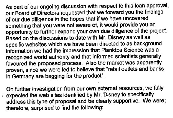 Of particular interest in Smith's investigation are documents he found: communications between the Haida Gwaii Old Masset Village Council and the Northern Savings Credit Union. The credit union performed due diligence on George and his company Planktos and warned the Old Masset Village Council of serious factual inconsistencies. Here are two excerpts from a letter from the Northern Savings Credit Union to the Old Masset Village Council, a year before George dumped the iron in the ocean: