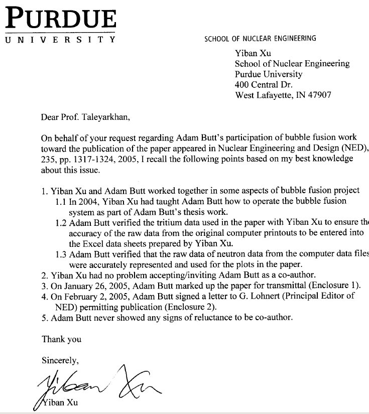Yiban Xu - Letter to Taleyarkhan