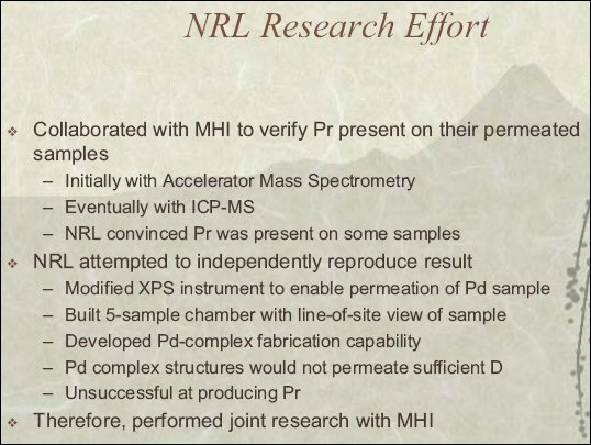 That is correct. NRL confirmed the presence of praseodymium from a Mitsubishi LENR transmutation sample. Grabowski also states this in the slide shown above.