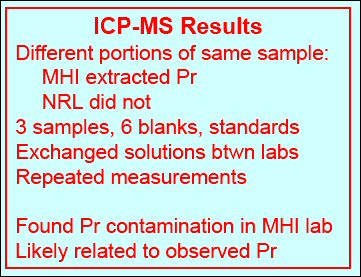 "After he came back to NRL, Kidwell performed ICP-MS analysis, and Grabowski informed us that our balance was contaminated by praseodymium. It was unbelievable, for we have never used praseodymium as a reagent in our clean room!"