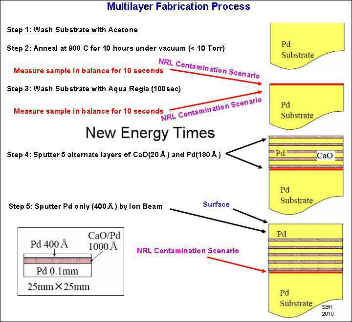 The following New Energy Times diagram is based on Iwamura's diagram presented at ICCF-15. As Iwamura explained, if the praseodymium contaminated the multilayered substrate in the balance, it would have to fall or be placed on top of the palladium substrate and below the layers of palladium and CaO which are sputtered on in step four. The substrate is put into the balance twice during the fabrication process. The following diagram displays these steps in detail (click image to enlarge).