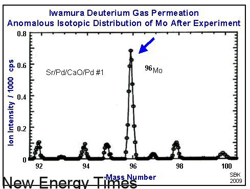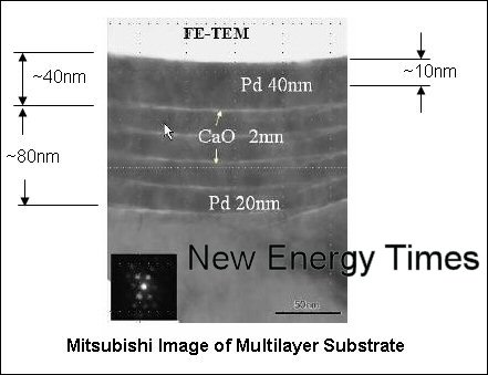 The essential part of the experiment is a multilayered substrate of palladium and calcium oxide. On the surface of the substrate, the Mitsubishi researchers place atoms from a given element. Deuterium gas is passed through the substrate. As the experiment progresses, the given element is seen to decrease in quantity, and an element which was not present before the experiment slowly appears on the surface and increases in quantity.