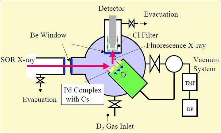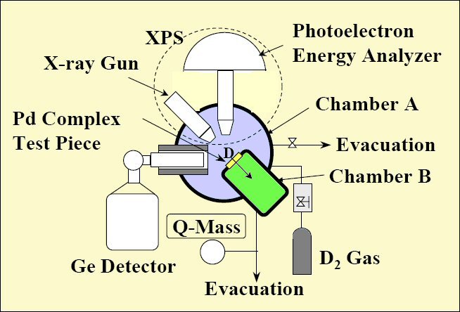 Once the experiment begins, the Mitsubishi researchers stop the deuterium gas flow periodically to perform the XPS measurements. They run the deuterium gas permeation from two days to a week, then evacuate the deuterium from chamber A and perform the XPS analysis on the surface of the palladium substrate. They usually do this a few times over the course of the experiment to observe the time dependency of the given as well as newly created elements.