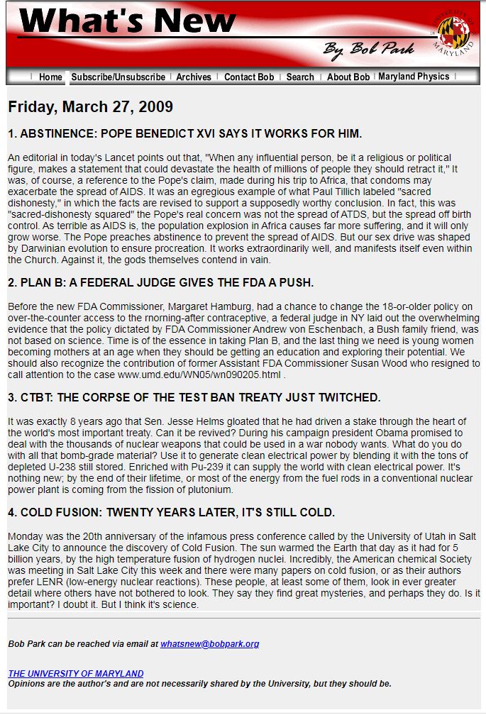 Finally, on March 27, 2009, in his weekly report, Park commented on the LENR symposium at the American Chemical Society in March 2009, which electrochemist Jan Marwan and I organized: