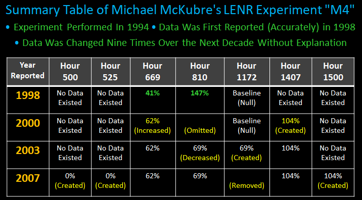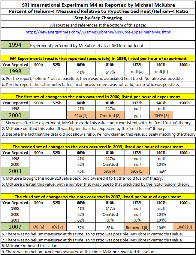 For a decade, electrochemist Michael McKubre's experiment M4 was proclaimed as the "proof" of "cold fusion." However, during a 10-year period, McKubre gradually changed, added, and deleted scientific data points and values – all without scientific explanation, most without notification. The end-result was a graph that he claimed proved the D+D > 4He + 24 MeV "cold fusion" theory. New Energy Times investigated and publicly reported this matter in 2010. McKubre withdrew these data without note or comment on March 22, 2010. Although we are advocates for LENRs, we denounce McKubre's actions.