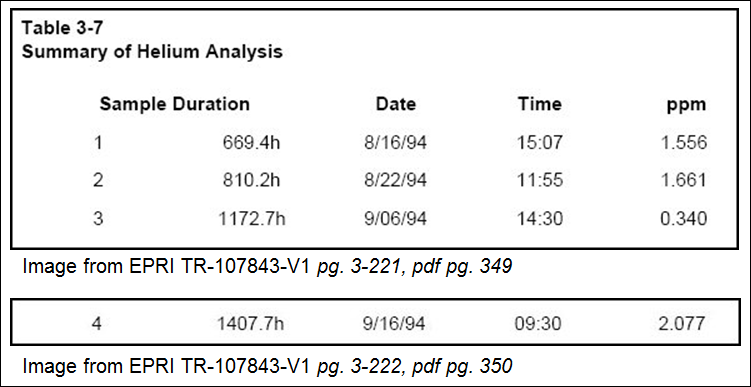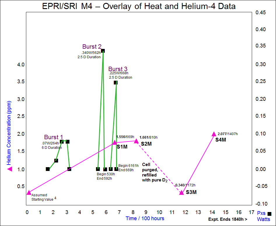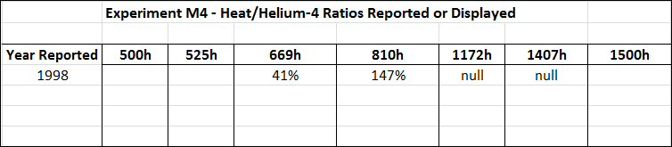 In experiment M4, only four helium-4 samples were taken. The complete original report for experiment M4 appears in the 379-page report from the Electric Power Research Institute (EPRI) titled "Development of Energy Production Systems From Heat Produced in Deuterated Metals, Volume 1, TR-107843-V1." [1] Here are the images that identify those four helium measurements.