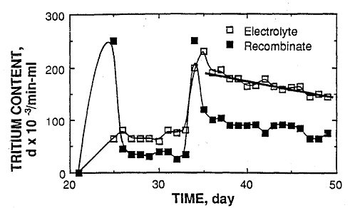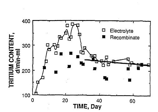 Figure 1 shows this behavior for a cell (#4) studied at Texas A&M[1]. The gas phase over this and several other cells at Texas A&M contained a much higher tritium concentration for a brief time than did the electrolyte. This indicates that the production rate of DT gas exceeded the rate at which it could exchange with dissolved gas as the evolved gas bubbled through the electrolyte. These bursts of tritium in the gas correspond to measured increases in the tritium content of the electrolyte. Therefore, some of the tritium generated at the cathode was able to enter the electrolyte as DT and/or DTO. Because the sampling interval was only daily and because of the unknown amount of recombinate, it is not possible from this figure to compare the total amount of tritium in the gas to that in the electrolyte. After the last tritium burst, the tritium content of the electrolyte decreased and approached a constant rate of decrease after several days.