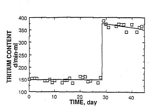 To test the behavior of a spiked cell, we added tritiated water to an inactive D 2 0 cell that had been running for 125 days without producing tritium. After the tritium was added as HTO, a complete inventory was kept of tritium that was added to the cell in the replacement D 2 0 and that left in the gas phase and during sampling. Figure 3 shows the tritium concentration in the electrolyte as a function of time. [3] The steady drop is caused by dilution when the electrolyzed D 2 0 was replaced by D 2 0 having a lower tritium content. In addition, a small amount of enrichment would be associated with this process because the gas has a lower T/D ratio than does the liquid. If these two factors are taken into account, the excess tritium content of the electrolyte remains constant. This analysis shows that there is no mechanism to cause the tritium content of the electrolyte to drop rapidly to a constant rate of decrease if tritium is added as tritiated water. The addition of tritiated water produces a constant rate of loss immediately after its addition. Only the addition of gaseous tritium would produce behavior similar to that observed in the cold fusion cells. It is hard to believe that someone at Texas A&M would realize this behavior to be characteristic of cold fusion cells, have HT or DT gas available and have the equipment to bubble this gas through the electrolyte at just the right rate.